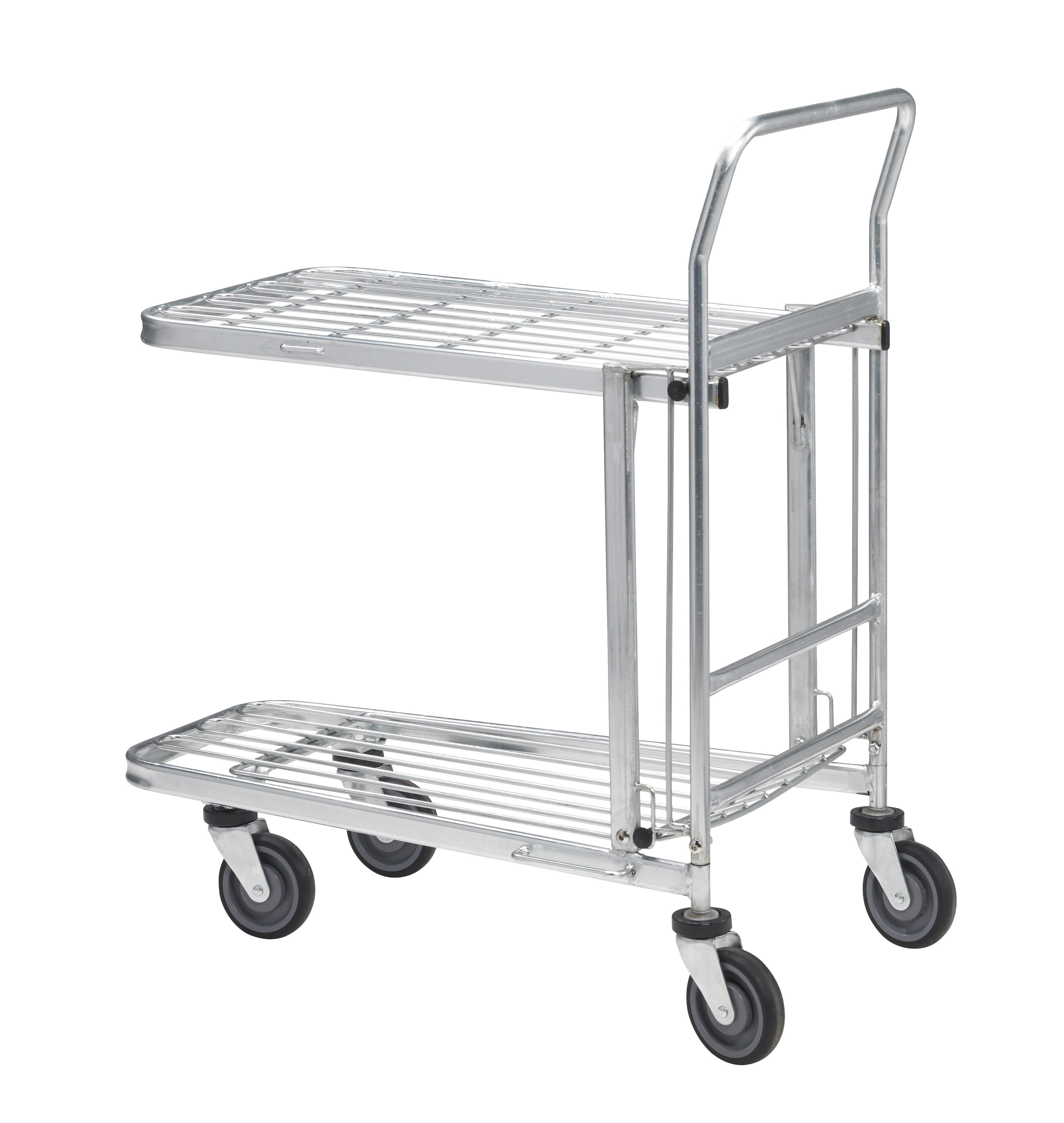 En hendig og fleksibel plukkvogn til lager og butikk: Topphyllen kan enkelt felles inn slik at trallene kan stables i hverandre på rekke.
