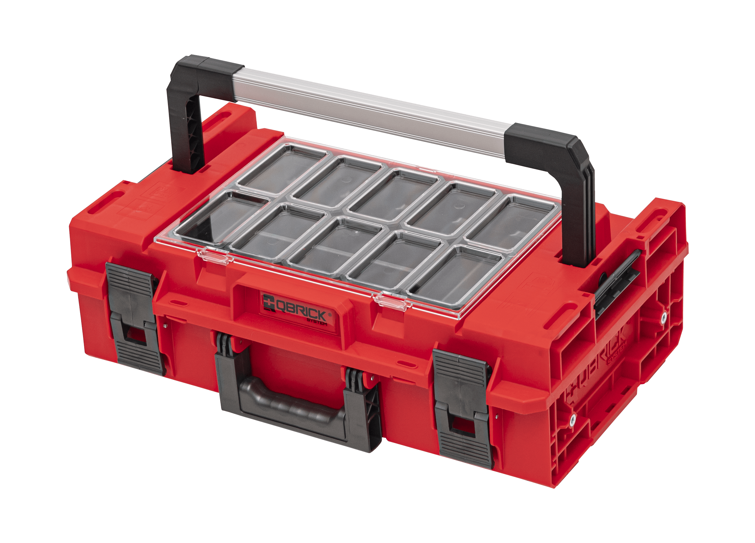 Verktøykasse i ONE Expert RED-serien som har oppbevaring både i kassen og i lokket. 8 stk innsatser i lokket gir enkel tilgang til skruer og forbruksmateriell. Kassen er utstyrt med håndtak på toppen av kassen, i tillegg til standard bærehåndtak. Kassen har 2 uttakbare skillevegger som gjør organiseringen veldig fleksibel. Kompatibel med alle QBRICK ONE-produkter på tralle eller verktøybrett. Kapasitet på 15,4 liter.